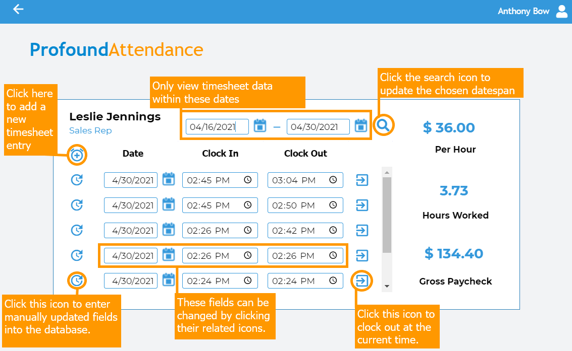 A visual representation of the timesheet functionality is shown below. Additionally, all icons will display a nifty tooltip when hovered over.