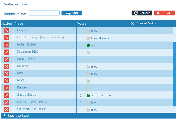 This app allows a team to decide where to go for lunch (or dinner) by using acceptance voting.
