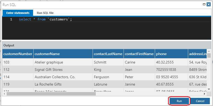 A Select statement will appear in the Run SQL dialog. Press Run.