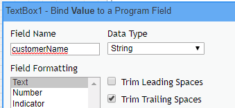 Click the button to bring up the Binding Dialog. You can then type a field or variable name, select a data type, and specify formatting options.