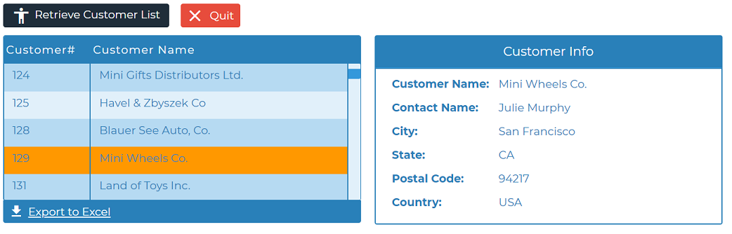 Displaying information in grids is fundamental to developing applications. This demo application displays a list of products in a grid.