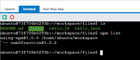 This template demonstrates the use of Node Package Manager (or npm). npm is the world's largest software registry of reusable packages. In this example, we use a simple package named 'num2fraction' that can translate a decimal value into a fraction.