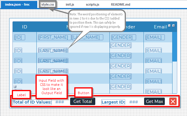 ► Now's the time to write code that will get and display the result of the data manipulation. The code could be added directly to the onclick events of the buttons, but this does not allow for easy reuse of the code. So, I instead put the code in functions that can call from any event I want to use it. This script can be found in the script.js file of this workspace.