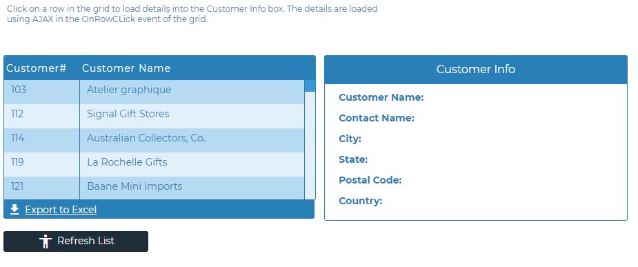 This space is fork of the REST Web Service template modified to load the customer details on the client side using AJAX in the OnRowClick() event of the grid.
